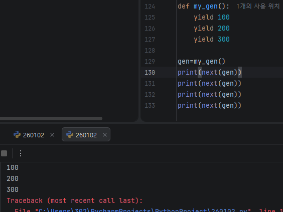 제너레이터는 내부적으로 필요한 값 하나만 밖으로 던지고 일시정지하는 성질