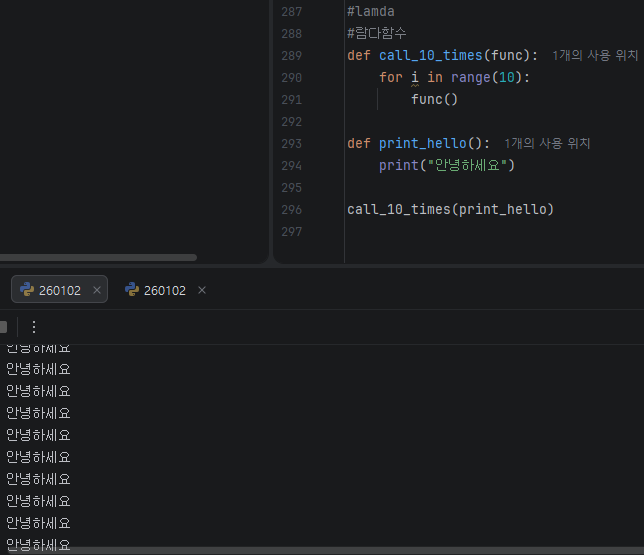 람다: 매개변수로 함수를 전달하기 위해 함수 구문을 작성하기 번거롭고, 코드 공간 낭비라는 생각이 들 때 함수를 간단하고 쉽게 선언하는 방법(1회용 함수 만들 때 자주 사용)