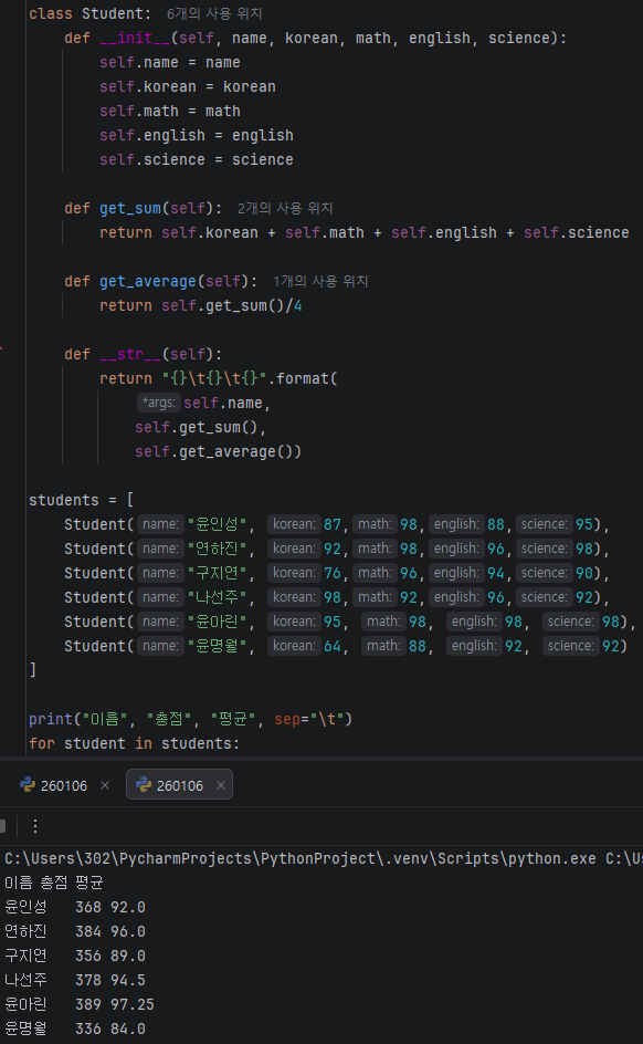 def __init__(self,name,korean,math,english,science): # 생성자함수 정의