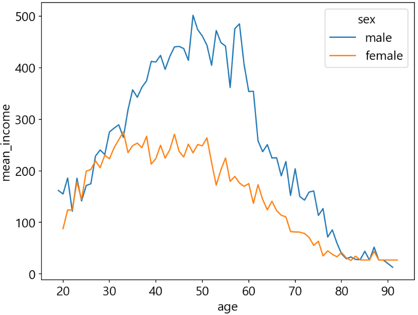 sex_age = welfare.dropna(subset = 'income').groupby(['age', 'sex'], as_index = False).agg(mean_income = ('income', 'mean'))