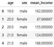 sex_income = welfare.dropna(subset = 'income').groupby(['ageg', 'sex'], as_index = False).agg(mean_income = ('income', 'mean'))