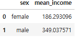 sex_income = welfare.dropna(subset = 'income').groupby('sex', as_index = False).agg(mean_income = ('income', 'mean'))