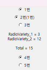 radio5=tkinter.Radiobutton(window, text="5번", value=15, variable=RadioVariety_2, command=check)