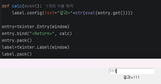 entry.bind("<Return>", calc)#키보드 입력 enter키와 bind 함수로 연동, 함수명