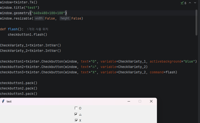 checkbutton3=tkinter.Checkbutton(window, text="X", variable=CheckVariety_2, command=flash)