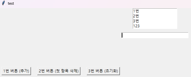 btn2 = tkinter.Button(window, text="2번 버튼 (첫 항목 삭제)", command=delete_first)