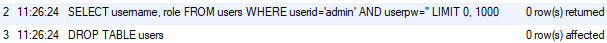 sql=f"SELECT username, role FROM users WHERE userid='{u_id}' AND userpw='{u_pw}'"