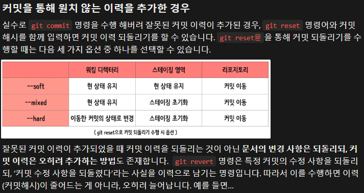 실수로 git add 명령을 수행 해버린 경우, git reset 명령어를 입력하면 스테이징 영역에 올라가 있던 파일을 초기화하여 워킹 디렉토리로 되돌릴 수 있음