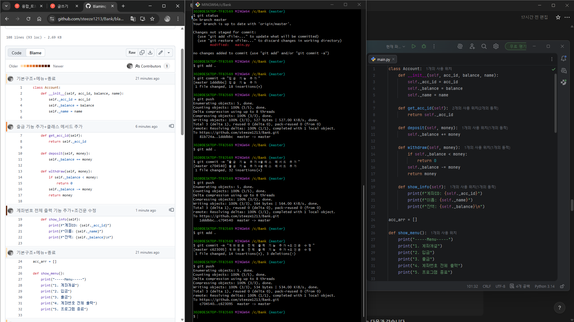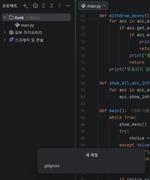 계좌개설, 입금, 출금, 계좌번호 전체 출력, 프로그램 종료… 총 다섯 개의 기능 항목이 있습니다. 기능을 하나 완성할 때마다 커밋을 추가할 것을 권장합니다.