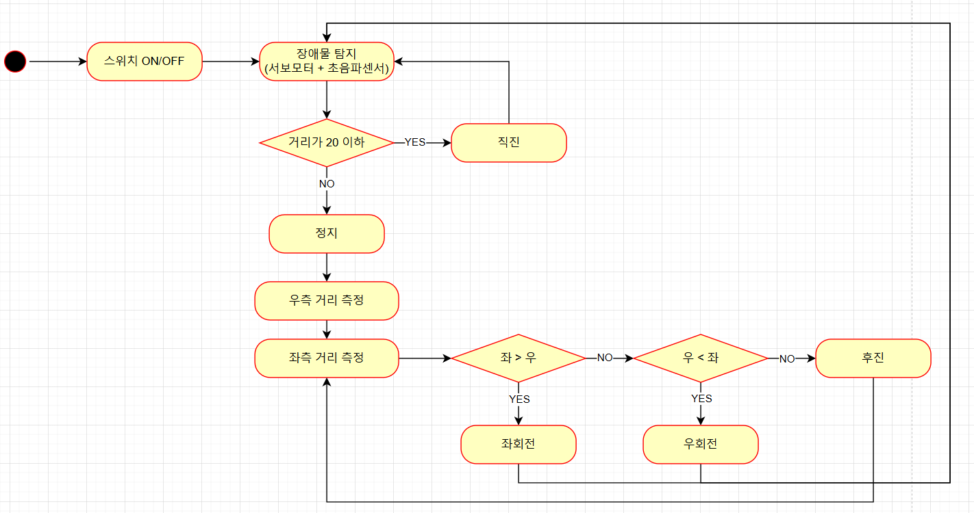 | 장애물 회피 로봇 | 자율 주행 + 장애물 회피 | AF Motor Shield, DC모터 × 4, 서보, HC-SR04 |